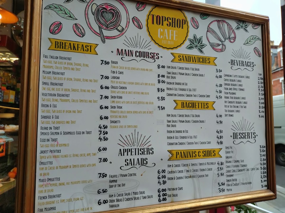The menu at this cafe offers a range of options suitable for breakfast, lunch, and light meals throughout the day. Visitors can find a selection of coffee and other hot beverages, fresh juices, and various light food choices.